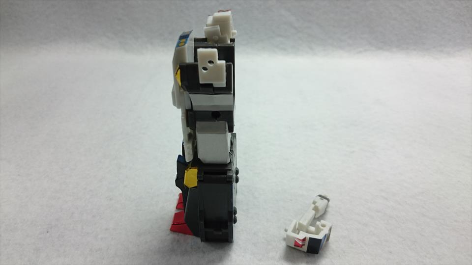 デッカードはパトカーモードにして足を上記のように曲げます。(この時事前に顔をスライドさせておくと楽ですが今回は撮影上そのままにしています)